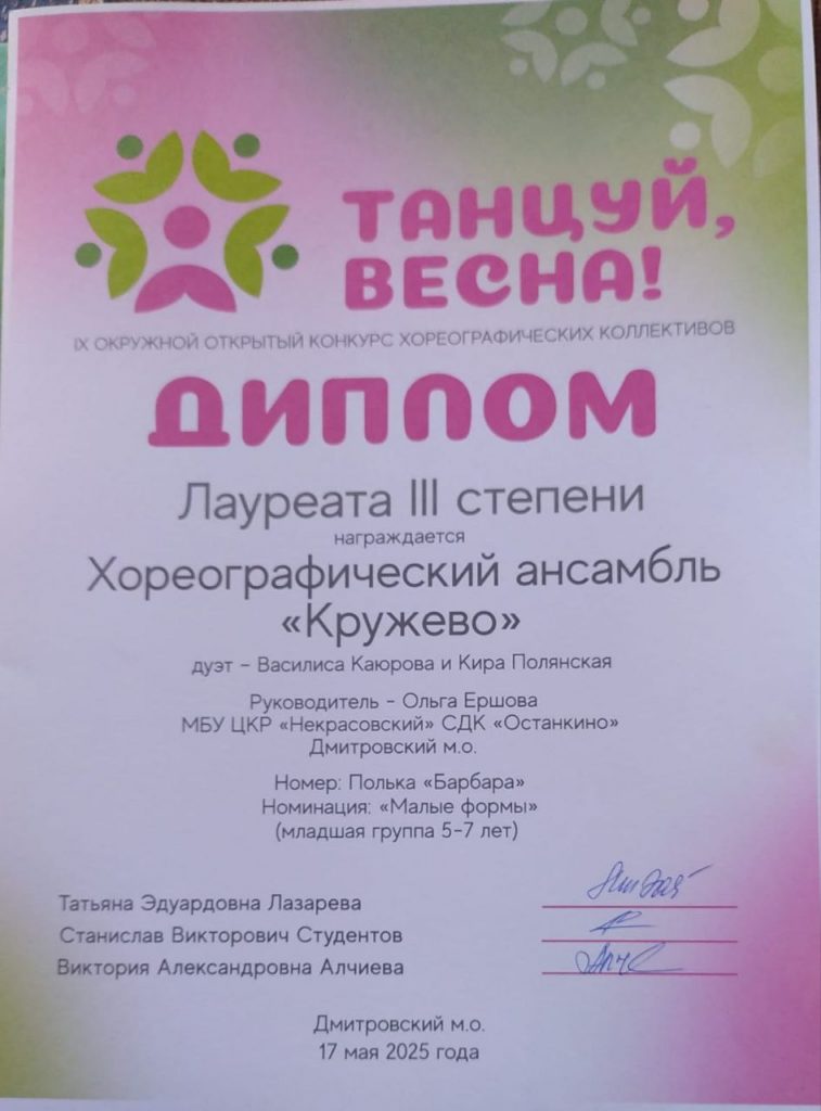 Поздравляем лауреатов VIII Окружного открытого конкурса хореографических коллективов «Танцуй, Весна 2025!», который проходил 17 мая 2025 года в МБУ ЦДК «Созвездие» филиала ДЗФС! Маленькие таланты хореографического ансамбля «Кружево» Сельского дома культуры «Останкино»покорили жюри и публику:
