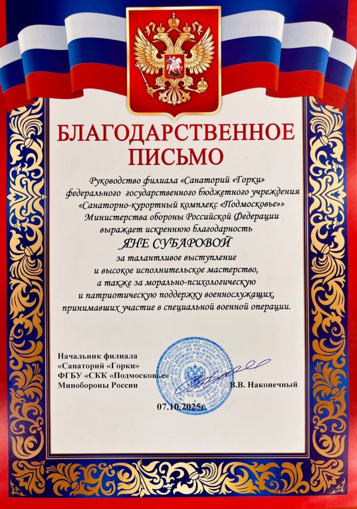 Выступление Субаровой Яны Игоревны стало ярким событием в культурной жизни санатория «Горки» и было тепло встречено отдыхающими. Патриотическая направленность концерта и профессиональное исполнение песен артисткой оставили неизгладимое впечатление у зрителей и подняли им настроение.